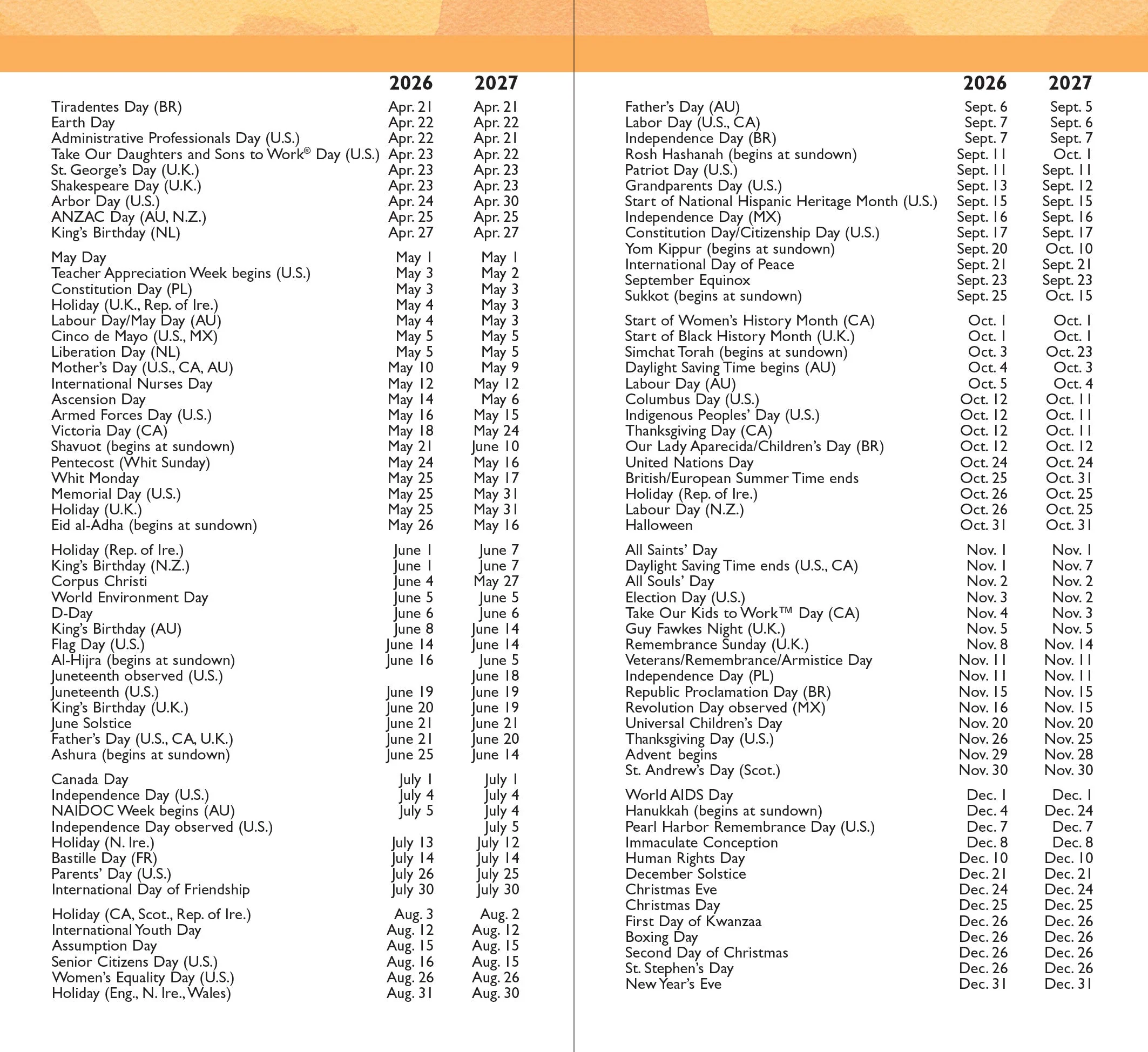 - Holidays, observances, and moon phases are included.