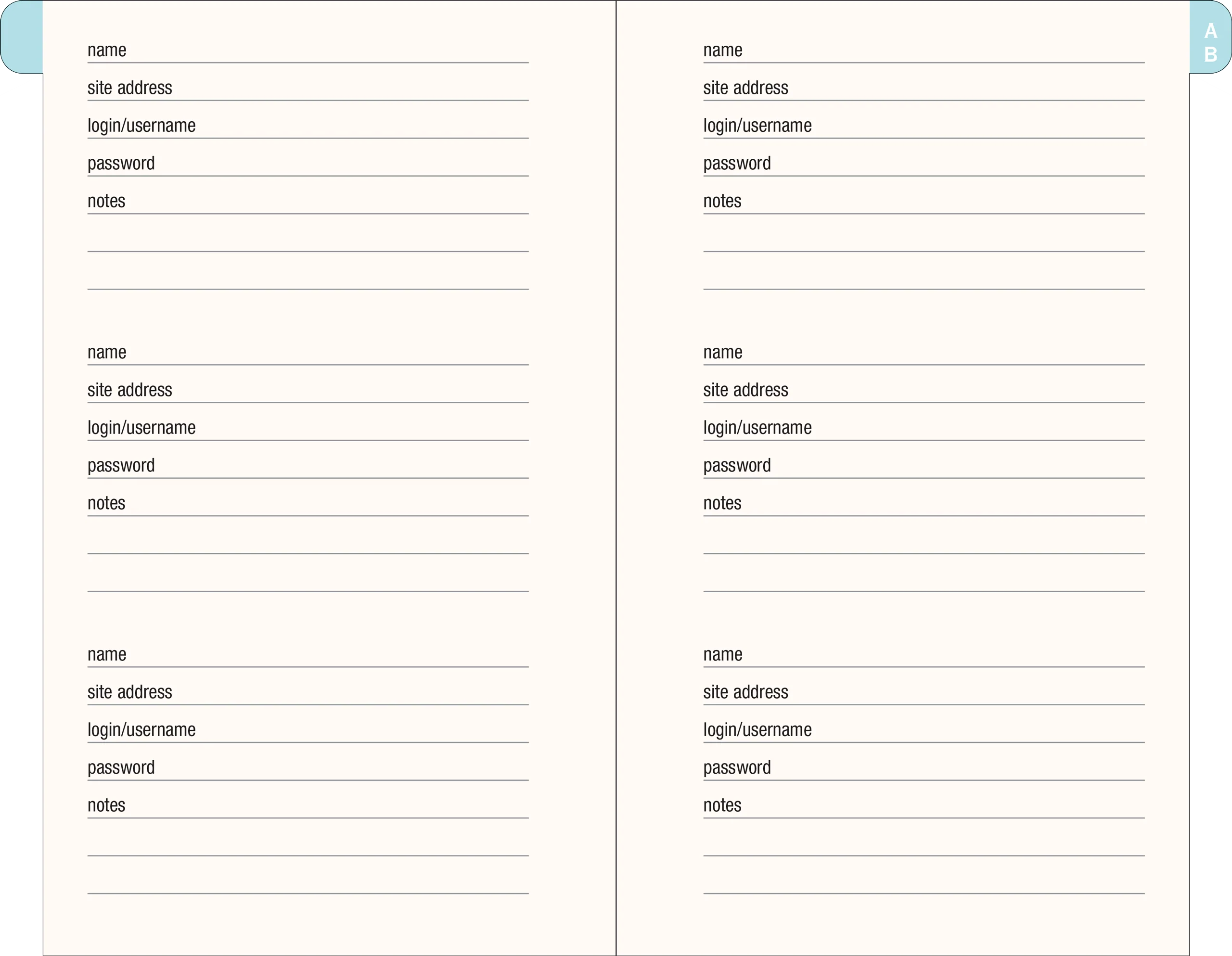 - This time- and headache-saving little volume is organized with tabbed A to Z pages, with space on each page to write down websites, usernames, passwords, and extra details.