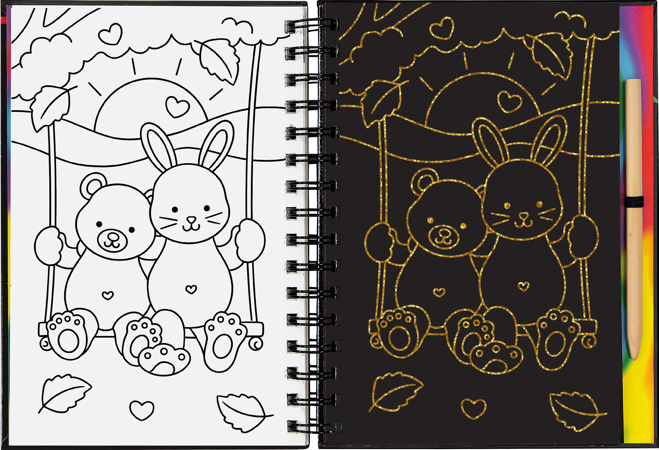 - Use the wooden stylus included to trace the white outlines on the black-coated pages and reveal the brilliant colors beneath!